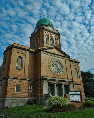 We outgrew the first church, begun in 1849 under the name of St. Francis. Floods destroyed our second church. Persevering through bankruptcy, we built our current church (St. Bernard) in 1914, which seats over 500. Over the next 18 years, we beautified the church, adding stained glass windows and a new facade. The eight breathtaking, stained glass windows of the Beatitudes were added in the midst of the Great Depression! More about our history can be found at History of SB