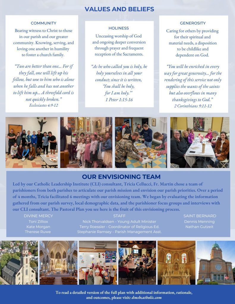 Led by our Catholic Leadership Institute (CLI) consultant, Tricia Cellucci, Fr. Martin chose a team of parishioners from both parishes to articulate our parish mission and envision our parish priorities. Over a period of 4 months, Tricia facilitated six meetings with our envisioning team. We began by evaluating the information gathered from our parish survey, local demographic data, and the parishioner focus groups and interviews with our CLI consultant. The Pastoral Plan you see here is the fruit of this envisioning process.