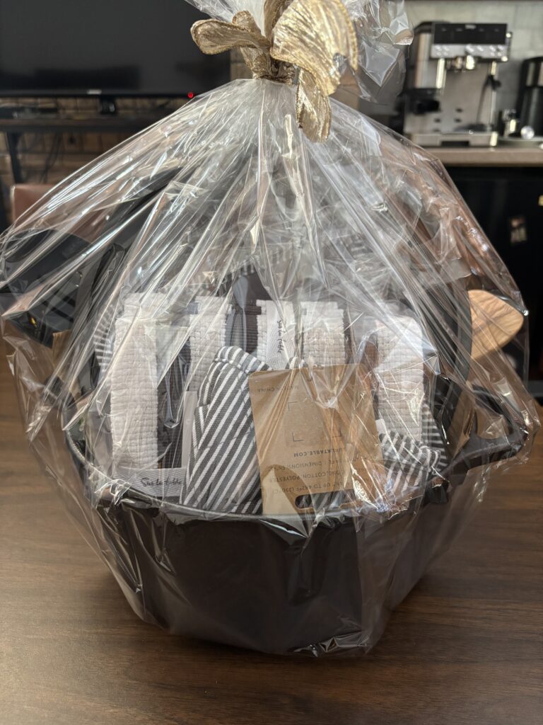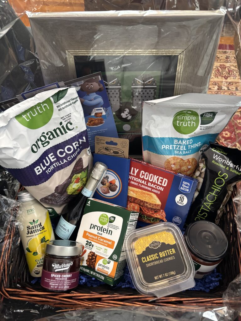 $175 custom framed charlie harper owl print, Sis’s $15 Gift Card, La Marca Prosecco, Blue Corn Chips, Salsa, St. James Brewed Tea, Bacon, Classic Butter Shortbread Cookies, Pack of Protein Bars, Spiced Cherry Preserves, Pistachios, Pretzels, Beer Cozy
