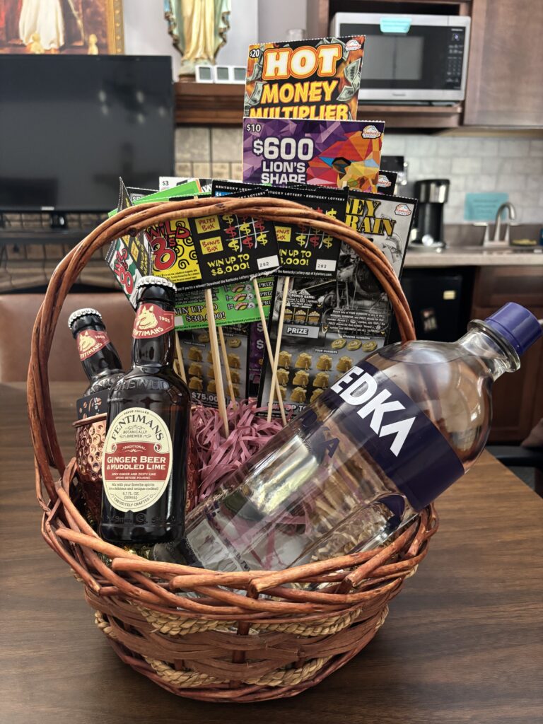 $60 worth of Scratch off tickets, Svedka Vodka 1.75 liter, 2x Fentimans Ginger Beer & Muddled Lime, Copper Beer Mug, $15 Sis’s Gift Card