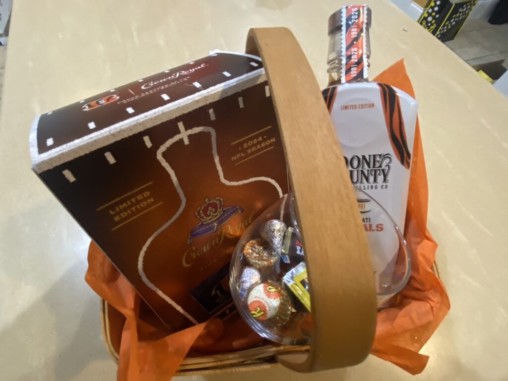 $100 New Riff Distilling Bonded Tour and Tasting for 4, Limited Edition Bengals Crown Royal, Limited Edition Bengals Boone County Small Batch Bourbon, Wine Glass filled w/ candy,