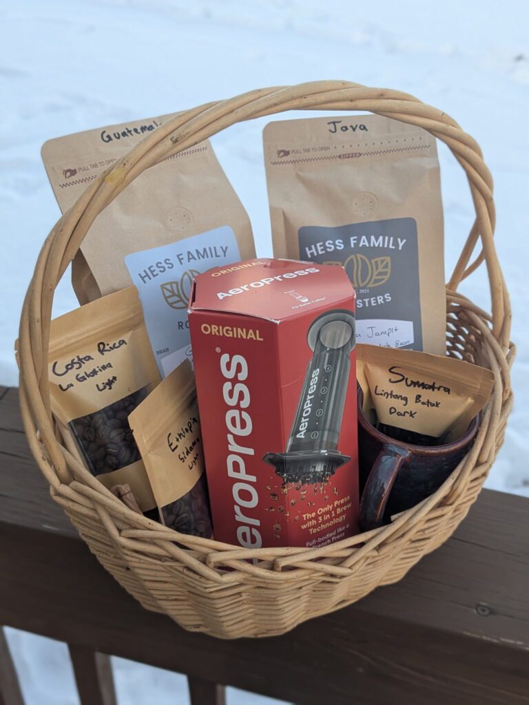 Hess Family Roasters gifts: AeroPress Coffee Maker, Full Bags of Guatemala and Java varieties, Handmade Mug, Samples of Costa Rica, Ethiopia, and Sumatra.